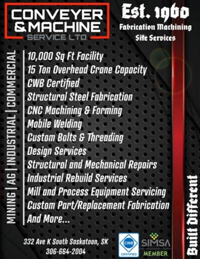 Conveyer and Machine Service Ltd is a full-service fabrication and machining shop with a 10,000 sq ft facility and 15-ton overhead crane capacity. We are CWB certified and specialize in structural steel fabrication, CNC machining and forming, mobile welding, custom bolts and threading, design services, structural and mechanical repairs, and custom part fabrication.